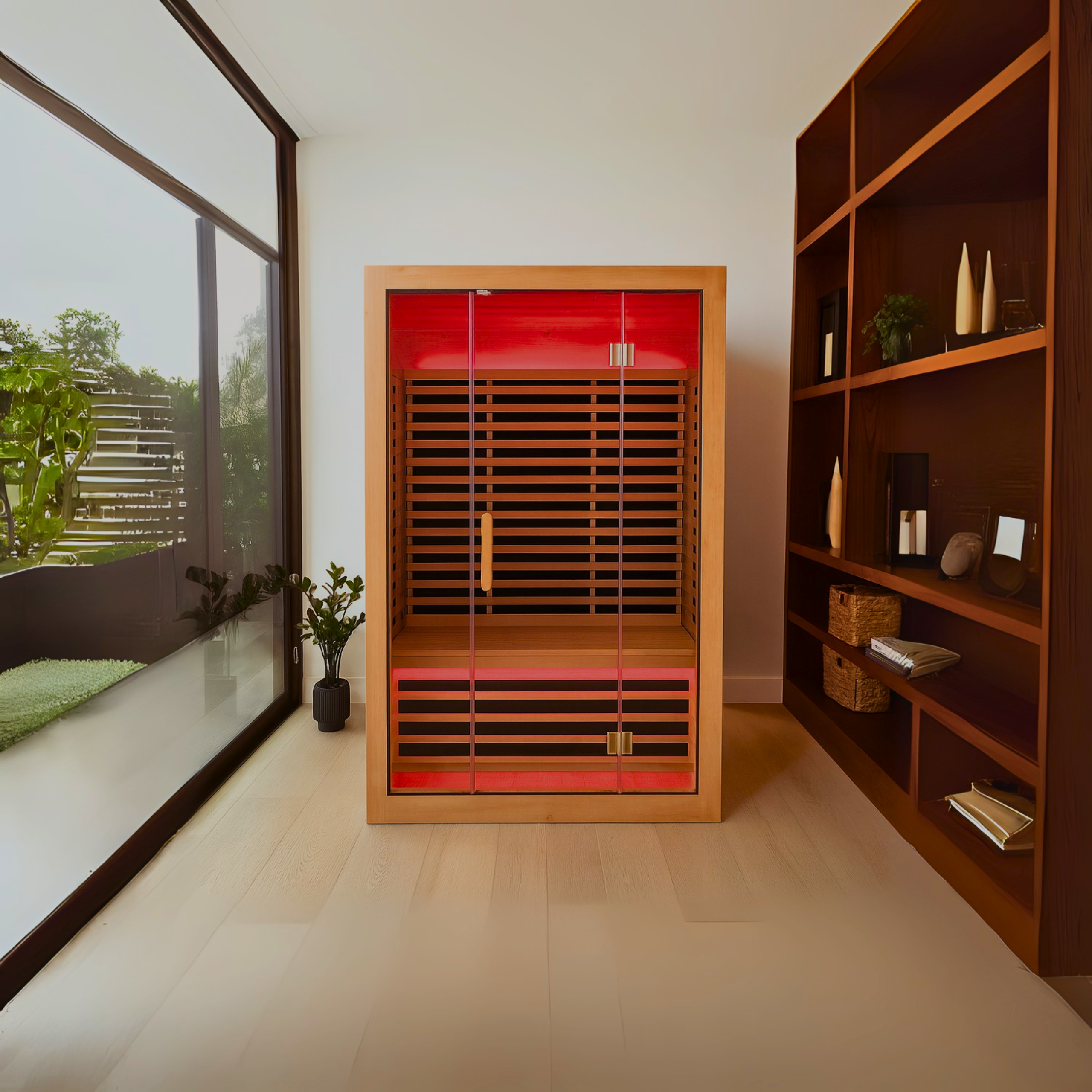 Space requirements vary by model. Our compact 1-person saunas need as little as 3' x 4' of floor space, while our largest 6-person models require approximately 7' x 7'. We recommend adding 6-12 inches of clearance on all sides for proper ventilation and access.